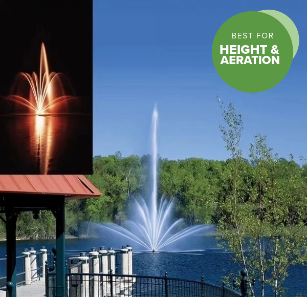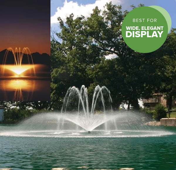 The Masters Series Prestwick floating lake fountain display is a two-tier pattern with an upper tier of 8 high arching streams and a lower tier of 8 wide arching streams. It comes in a range of sizes from 1HP units to 10HP units. The Masters series of fountains are simple to install and maintain and are backed by the industry’s finest pledge; designed and engineered for superior performance and longevity.